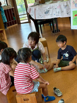 紙芝居「まっすぐ小僧とまがり小僧」を見ました。何でも面倒くさがらずにする『まっすぐ小僧』と、面倒くさくなってしなかったり、いい加減になってしまう『まがり小僧』。『まっすぐ小僧』と『まがり小僧』が綱引きをする場面では、『まっすぐ小僧』に勝たせたい、『まっすぐ小僧』が好きと口々に話していました。