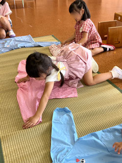 生活講習は「タオル絞り」です。薄手のA4サイズくらいのタオルを使ってしました。上手に絞るには、きれいに畳むことが大事と丁寧にしました。水につけたタオルはギュッと力一杯絞りますが、ここでも真ん中も端もしっかり絞ることを聞いて、絞ると「手が真っ赤‼」。大人が点検してみると、全くお水が出ない「お天気絞り」の人と、ほんの少ししずくが出た「ポツポツ絞り」の人ばかり。みんな随分としっかり絞れています。絞ったタオルで何かできる?の問いかけに、「テーブル拭く」。「床拭く」。今日は運動をした後で、冷たいタオルで顔を拭くと「気持ちがいい!」